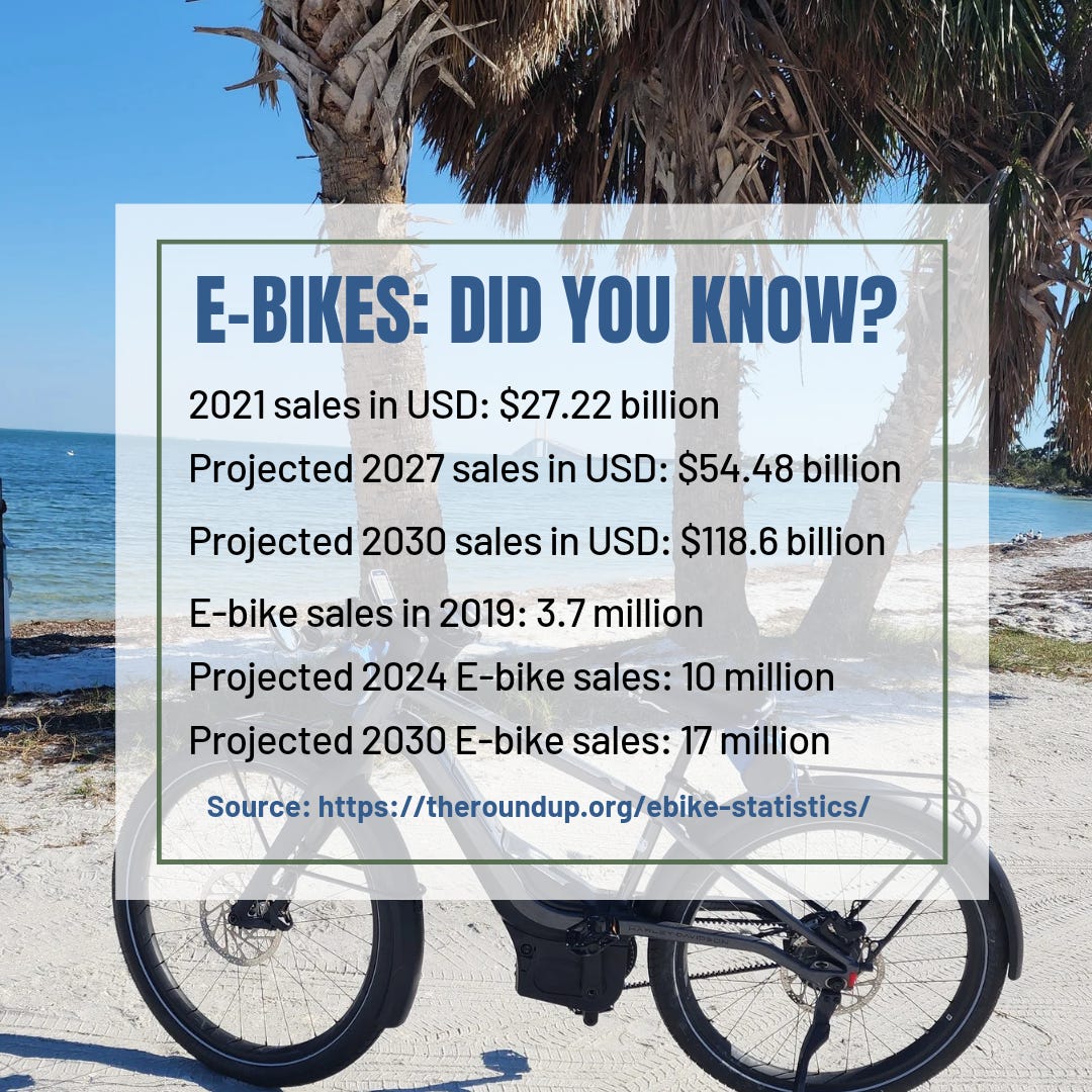 Let’s start by looking at the popularity and growth of the e-bike market. TheRoundup.org, a website dedicated to promoting environmental awareness and sustainability, has assembled 51 Official Eike Statistics & Facts with citations to the resources and studies to support the statistics. Read this article and follow the article’s links to sources if you want to dig deeper.